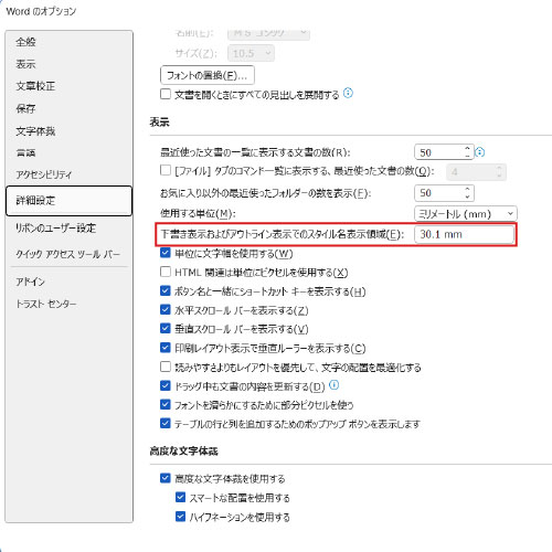 → 『下書き表示およびアウトライン表示でのスタイル名表示領域』の数値を増やしてみてね。