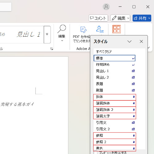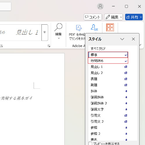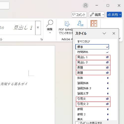 Wordに初めから用意されている「見出し」などのスタイルの多くは