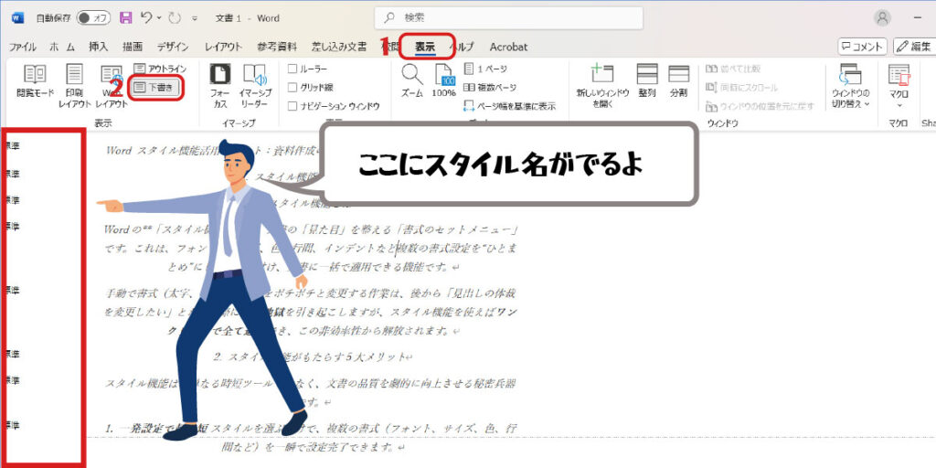 3. 画面の左側の余白に、各段落にどのスタイルが適用されているか、その名前が表示されます。