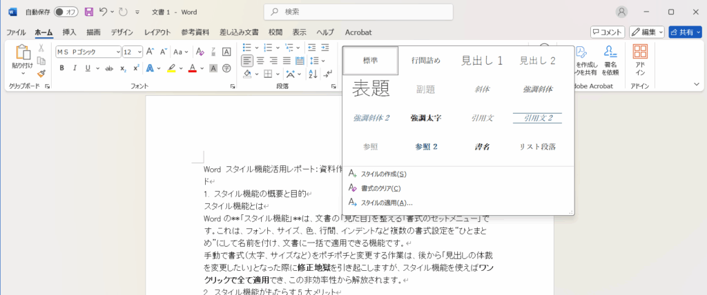 スタイルとは、フォント、サイズ、色、行間、インデントなど複数の書式設定を“ひとまとめ”にして名前を付け、一括で適用できる機能です。