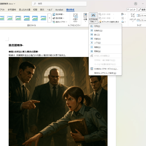 右上に表示されるレイアウトオプションのマークをクリックするか「図の形式」タブから「文字列の折り返し」を選択します。