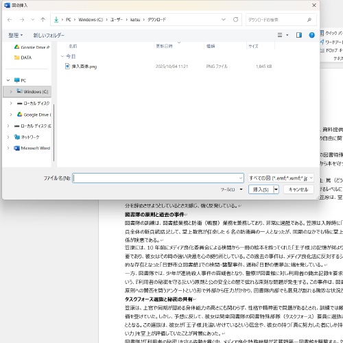 貼り付けたい画像を選択し、「挿入」をクリックするか、ダブルクリックします。