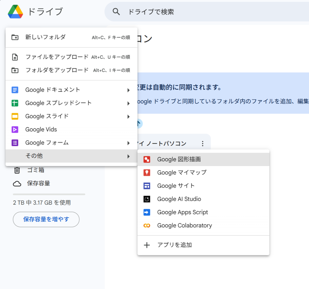 導入していない方はGoogle Colaboratoryが表示されないと思います。