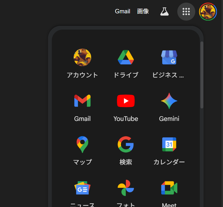 Googleサイトの右上にある●が9個並んだところをクリックして画像のようにGoogleのサービスが表示されたら