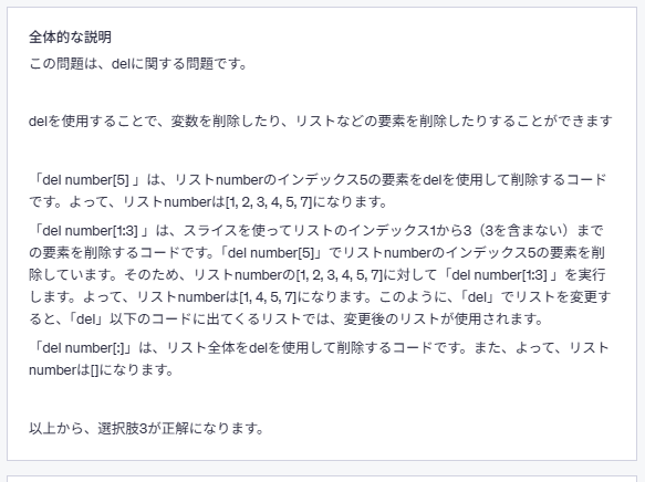 AIに「リストとタプルの違いに関する知識を問う、4択問題を5問作って」と命令するだけ。